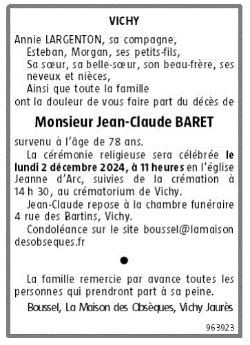 Cet espace « condoléances » est dédié à la mémoire de Monsieur Jean-Claude BARET.