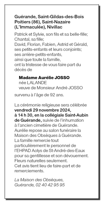 Cet espace « condoléances » est dédié à la mémoire de Madame Aurélie JOSSO née LALANDE.