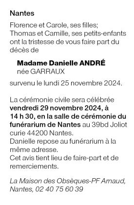 Cet espace « condoléances » est dédié à la mémoire de Madame Danielle ANDRÉ née GARRAUX.