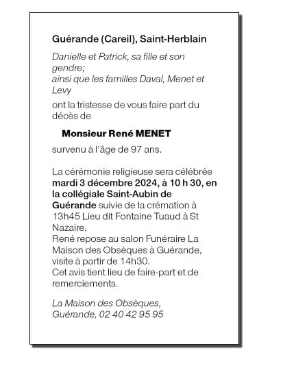 Cet espace « condoléances » est dédié à la mémoire de Monsieur René MENET.