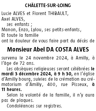 Cet espace « condoléances » est dédié à la mémoire de Monsieur Abel DA COSTA ALVES.