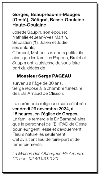 Cet espace « condoléances » est dédié à la mémoire de Monsieur Serge PAGEAU.