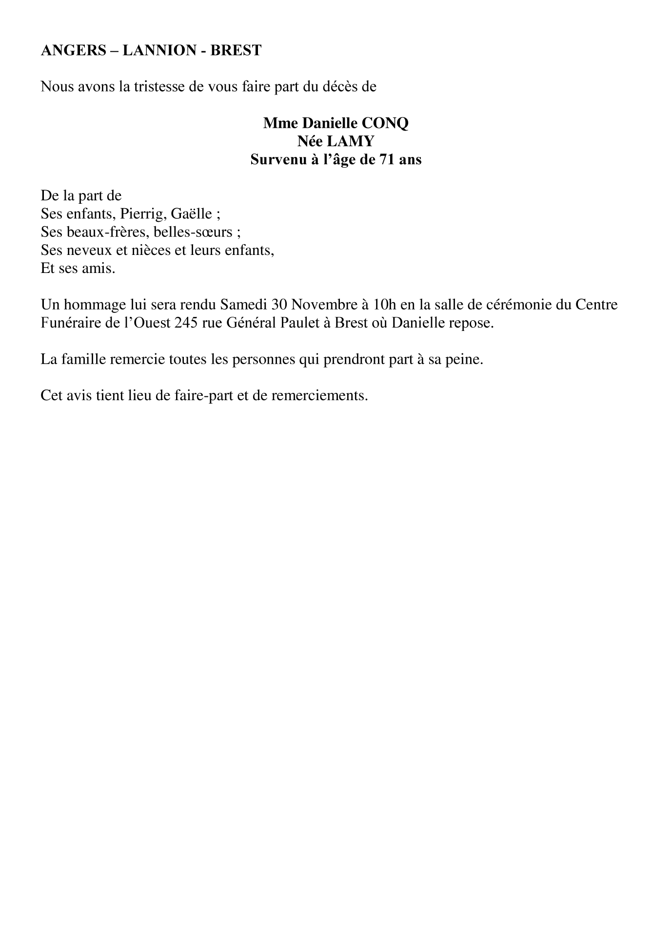 Cet espace « condoléances » est dédié à la mémoire de Madame Danielle CONQ née LAMY.