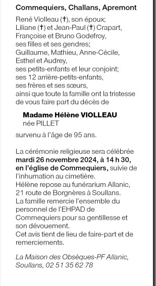 Cet espace « condoléances » est dédié à la mémoire de Madame Hélène VIOLLEAU née PILLET.
