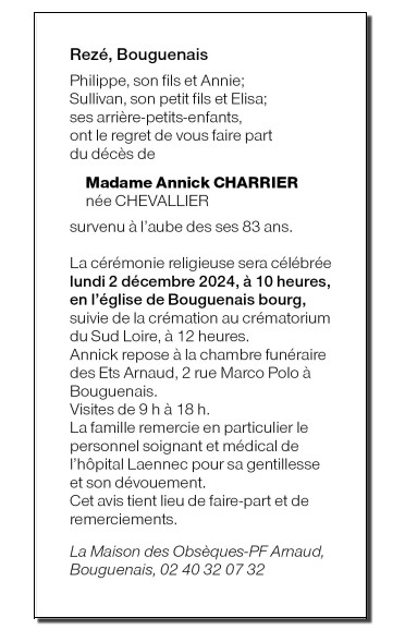 Cet espace « condoléances » est dédié à la mémoire de Madame Annick CHARRIER née CHEVALLIER.