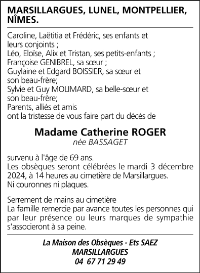 Cet espace « condoléances » est dédié à la mémoire de Madame Catherine ROGER née BASSAGET.