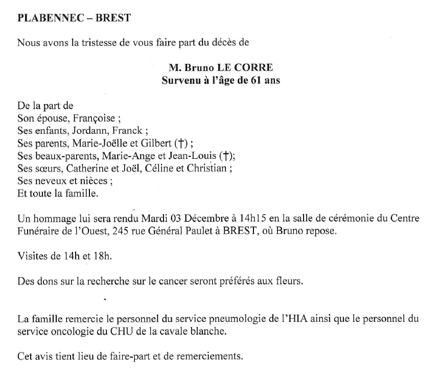 Cet espace « condoléances » est dédié à la mémoire de Monsieur Bruno LE CORRE.