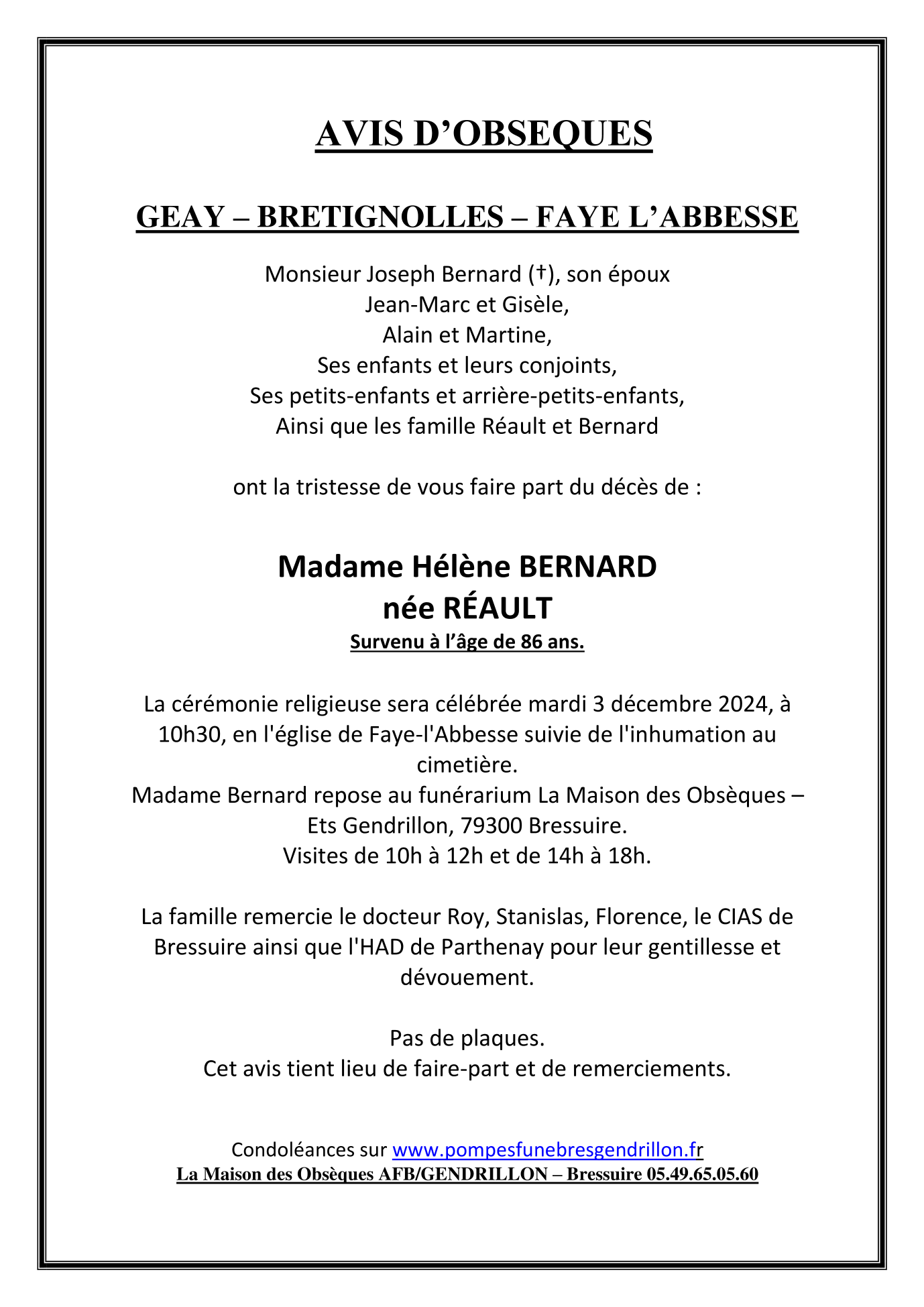Cet espace « condoléances » est dédié à la mémoire de Madame Hélène BERNARD née RÉAULT.