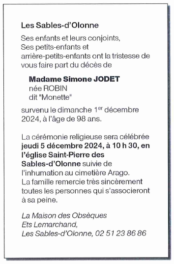 Cet espace « condoléances » est dédié à la mémoire de Madame Simone JODET née ROBIN.