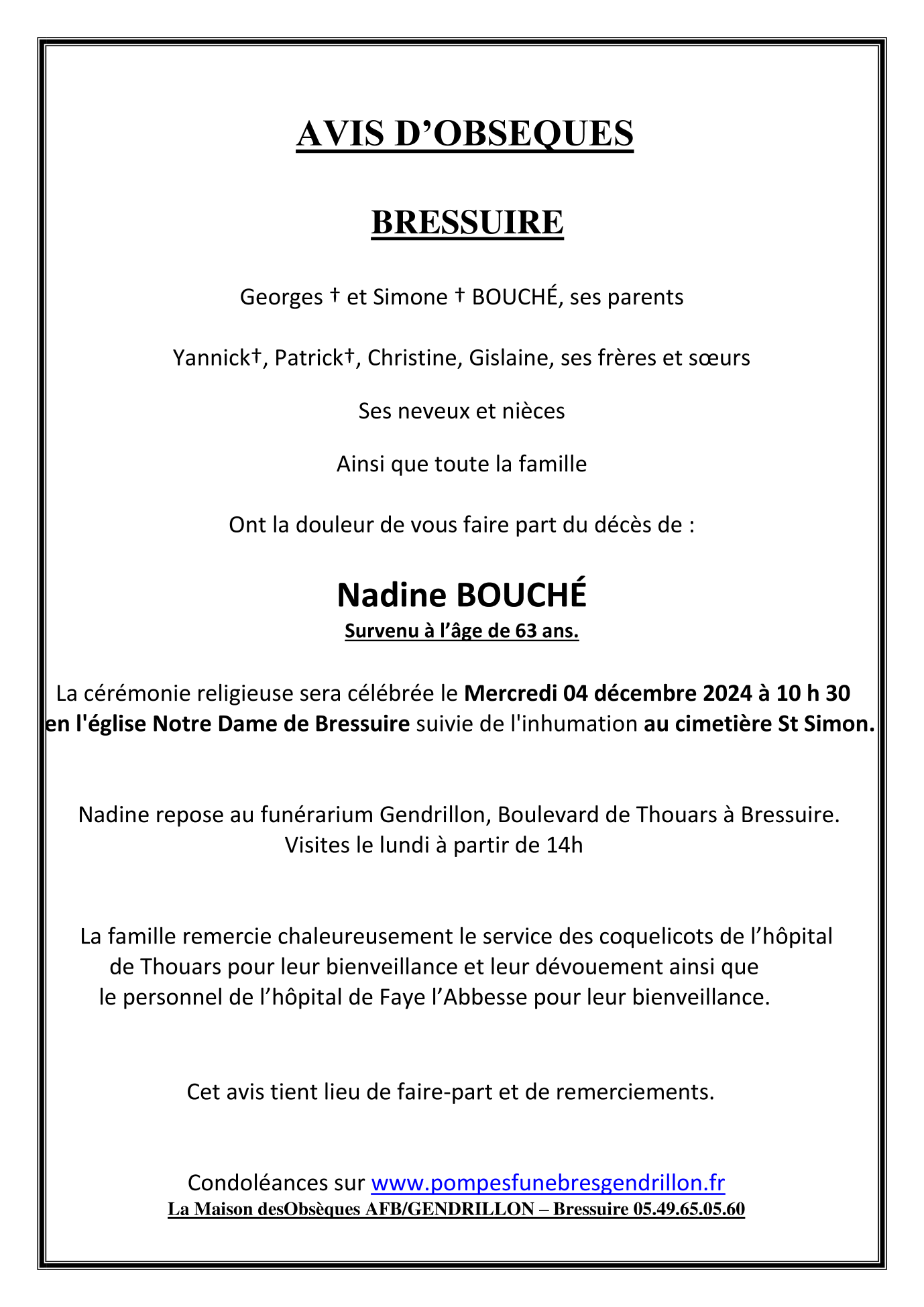 Cet espace « condoléances » est dédié à la mémoire de Madame Nadine BOUCHÉ.