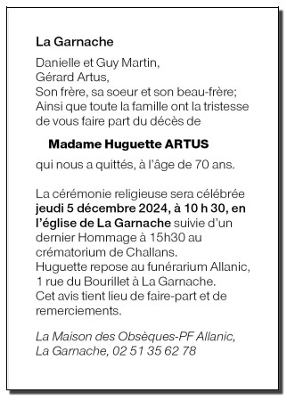 Cet espace « condoléances » est dédié à la mémoire de Madame Huguette ARTUS.