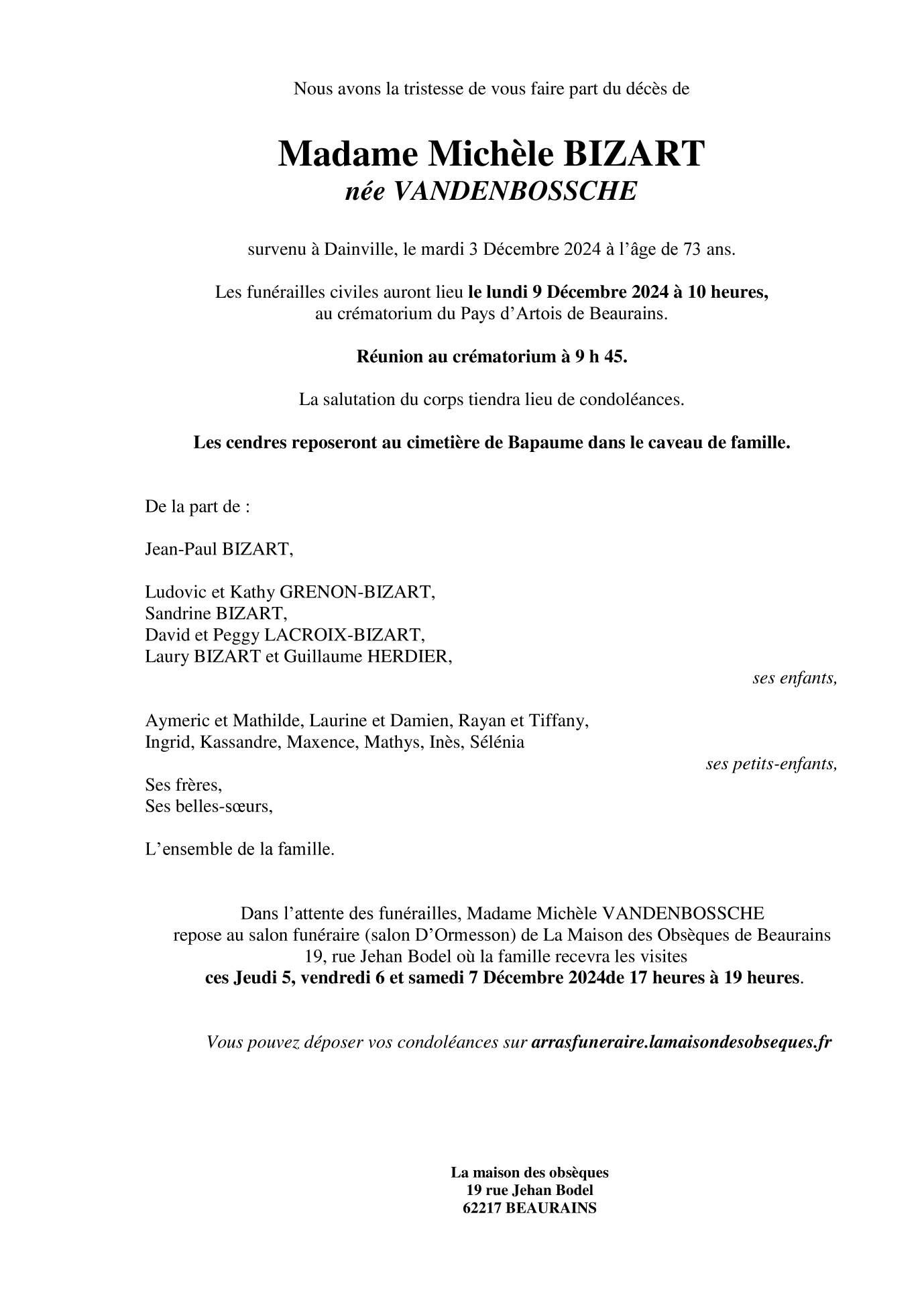 de Madame Michèle BIZART née VANDENBOSSCHE