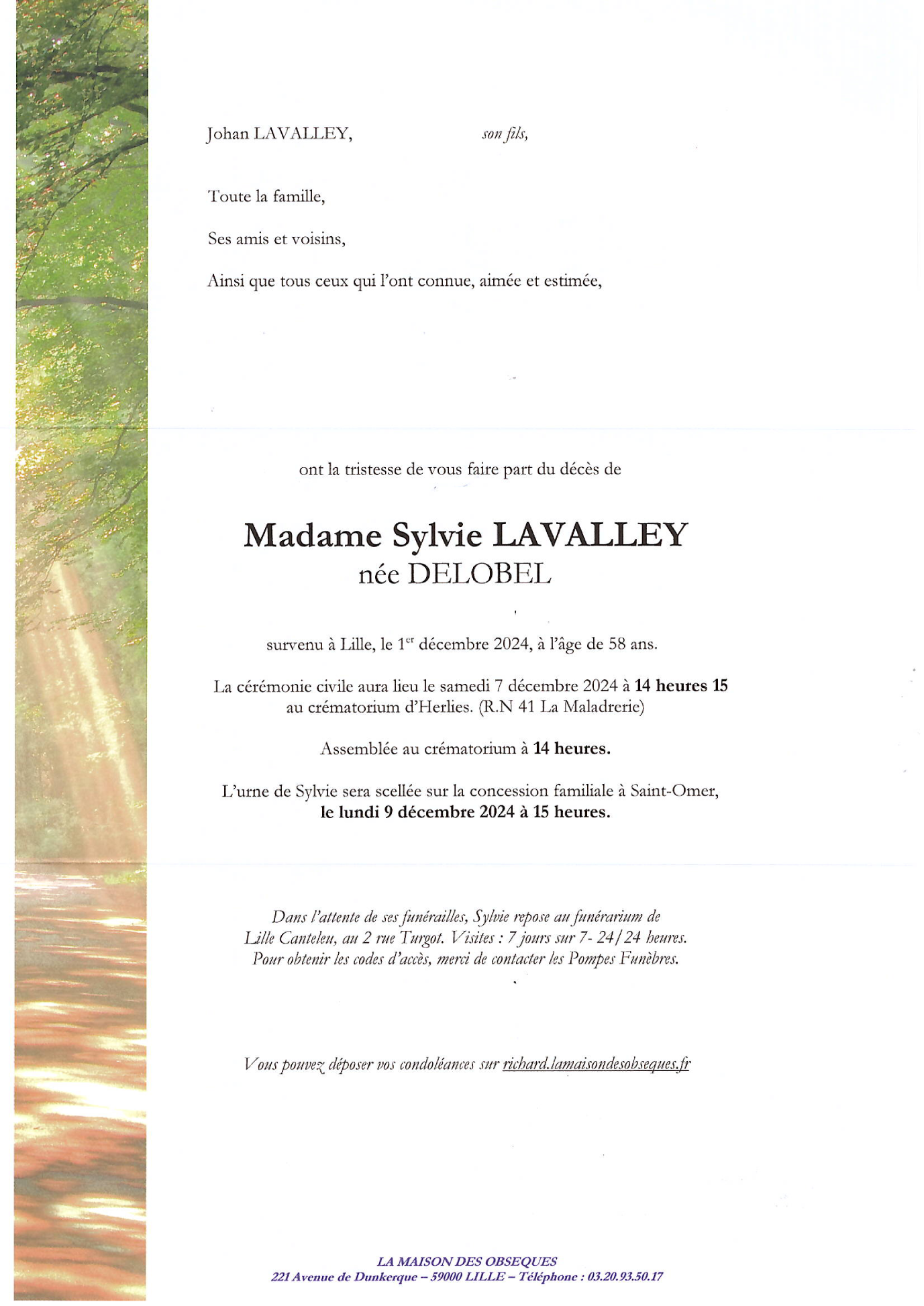 Cet espace « condoléances » est dédié à la mémoire de Madame Sylvie LAVALLEY née DELOBEL.