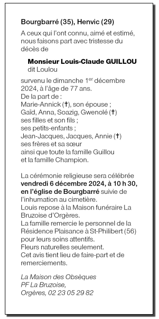 Cet espace « condoléances » est dédié à la mémoire de Monsieur Louis-Claude GUILLOU.