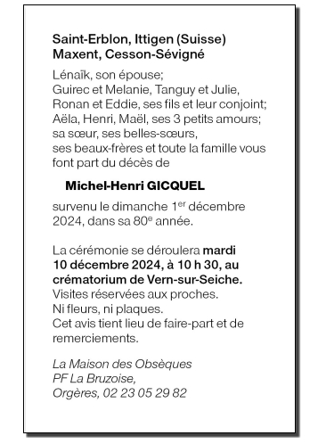 Cet espace « condoléances » est dédié à la mémoire de Monsieur Michel-Henri GICQUEL.