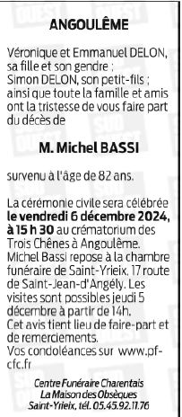 Cet espace « condoléances » est dédié à la mémoire de Monsieur MICHEL BASSI.