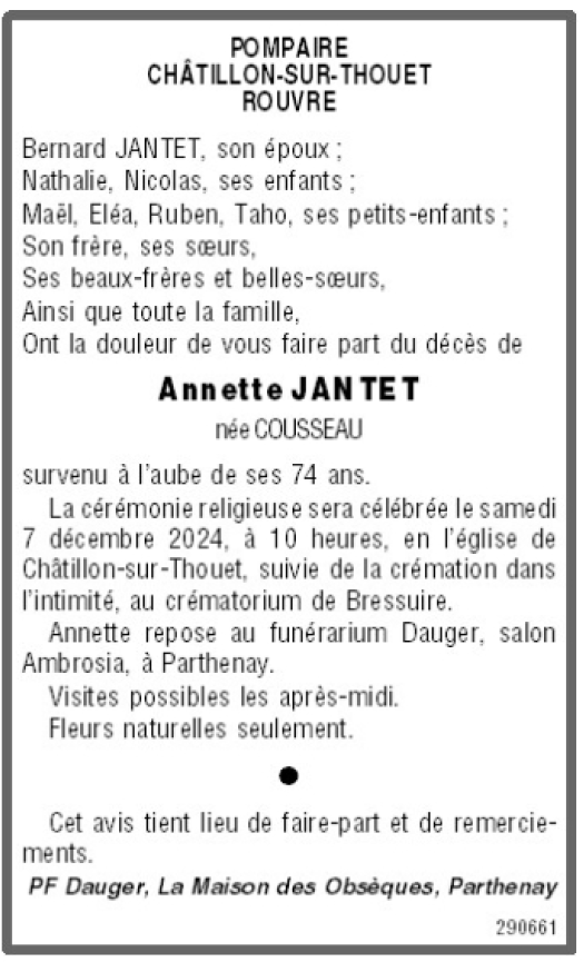 de Madame Annette JANTET née COUSSEAU