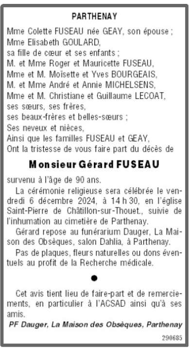 Décédé à Châtillon-sur-Thouet (79200) le mercredi 4 décembre 2024