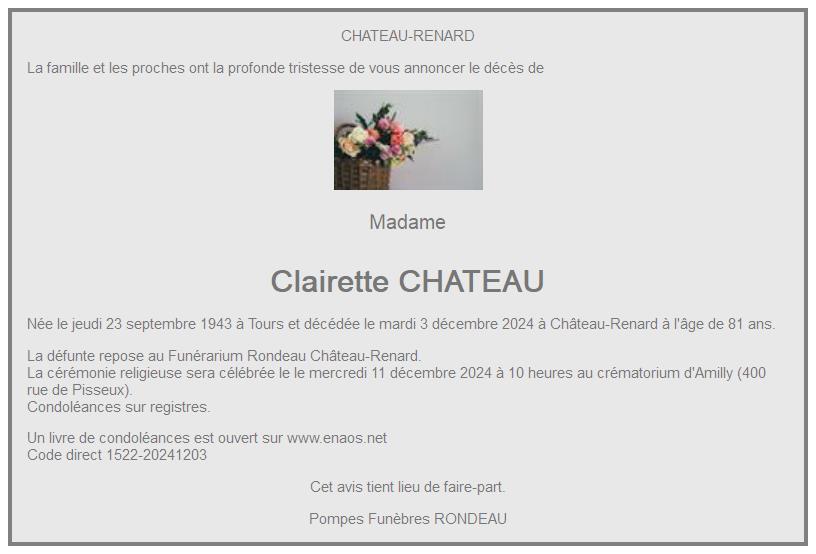 Cet espace « condoléances » est dédié à la mémoire de Madame Clairette CHATEAU.