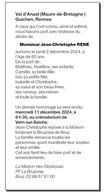 Cet espace « condoléances » est dédié à la mémoire de Monsieur Jean-Christophe RENE.