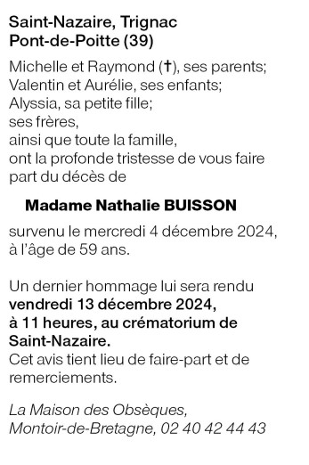 Cet espace « condoléances » est dédié à la mémoire de Madame Nathalie BUISSON.