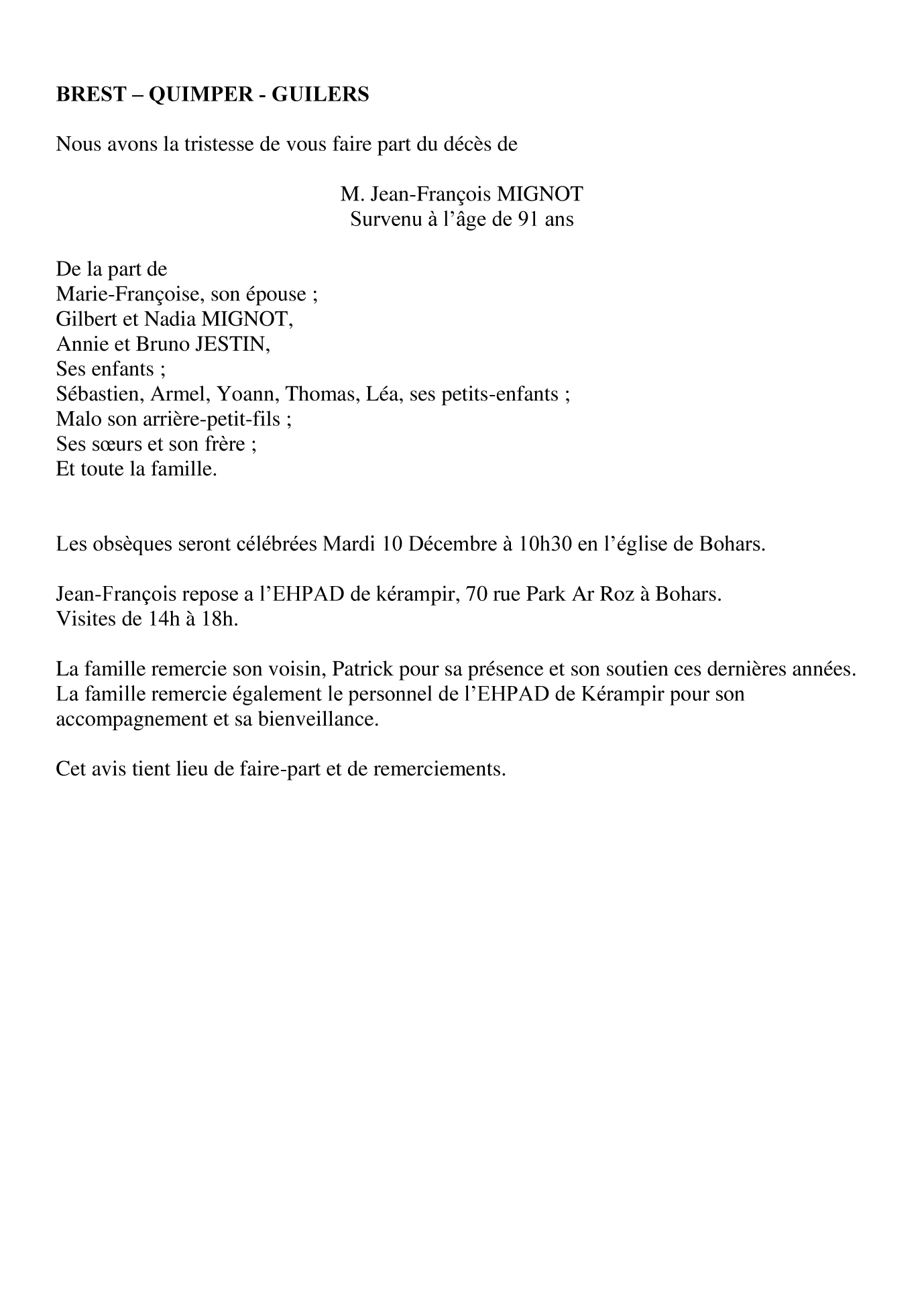 Cet espace « condoléances » est dédié à la mémoire de Monsieur Jean-François MIGNOT.