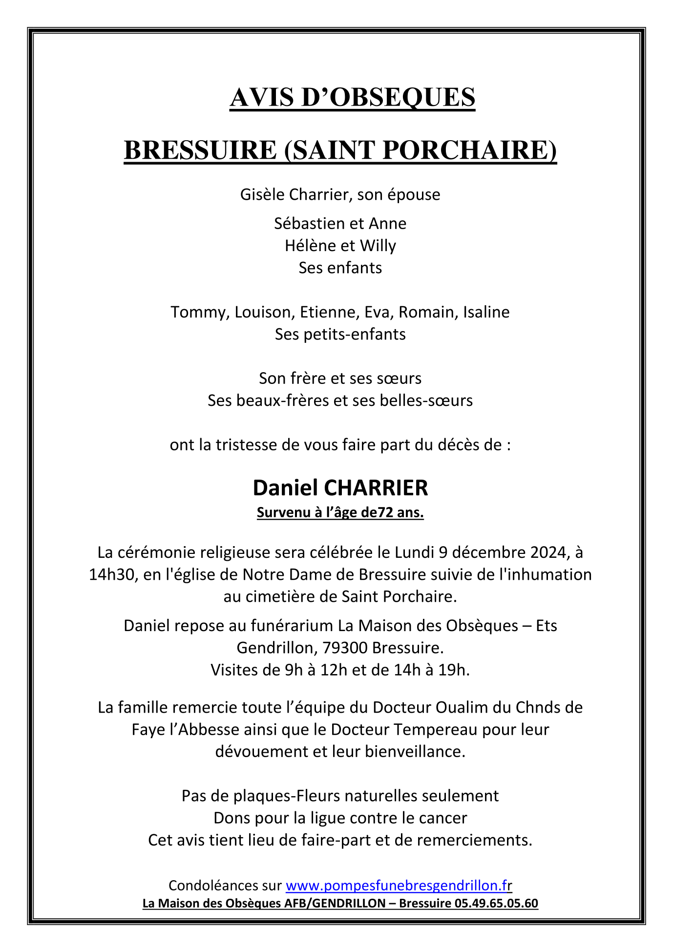 Cet espace « condoléances » est dédié à la mémoire de Monsieur Daniel CHARRIER.