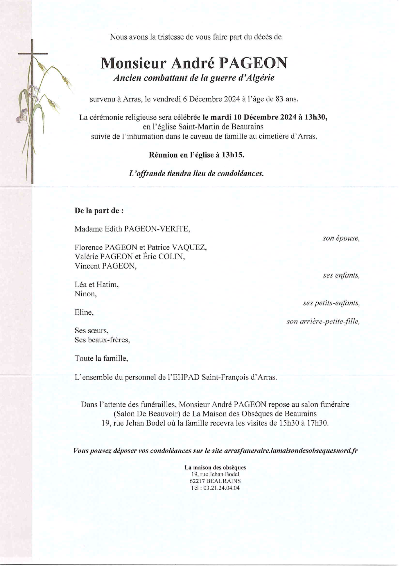 Cet espace « condoléances » est dédié à la mémoire de Monsieur André PAGEON.