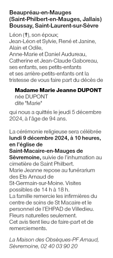 Cet espace « condoléances » est dédié à la mémoire de Madame Marie-Jeanne née DUPONT.