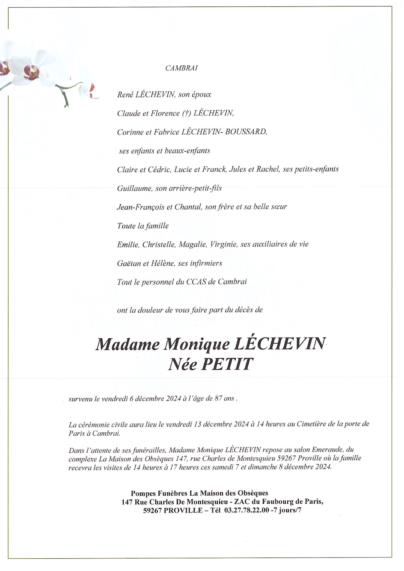 Cet espace « condoléances » est dédié à la mémoire de Madame Monique, Henriette, Marion LÉCHEVIN née PETIT.