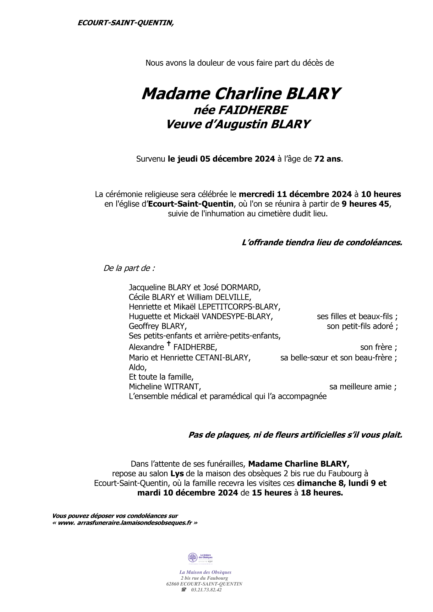 de Madame Charline BLARY née FAIDHERBE