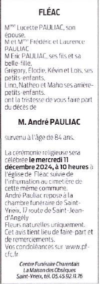 Décédé à Fléac (16730) le vendredi 6 décembre 2024