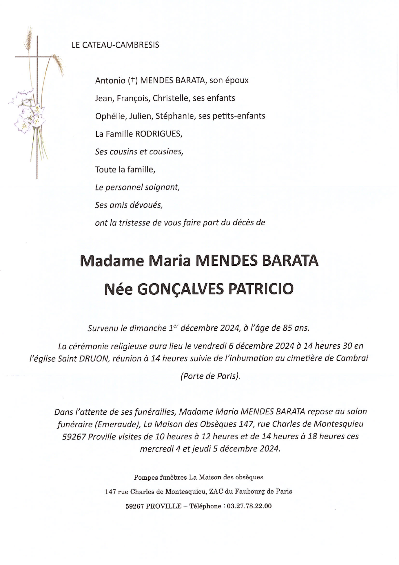 de Madame Maria MENDES BARATA née GONCALVES PATRICIO
