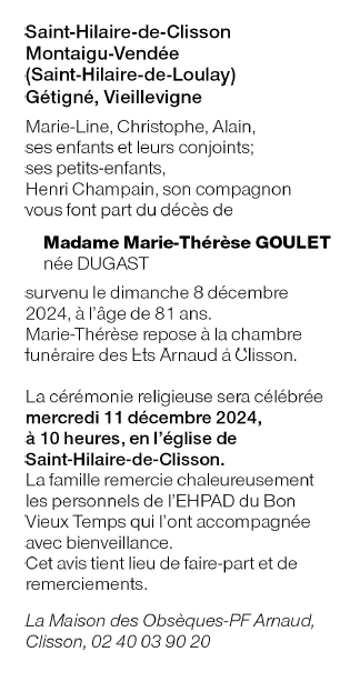 Cet espace « condoléances » est dédié à la mémoire de Madame Marie-Thérèse GOULET née DUGAST.