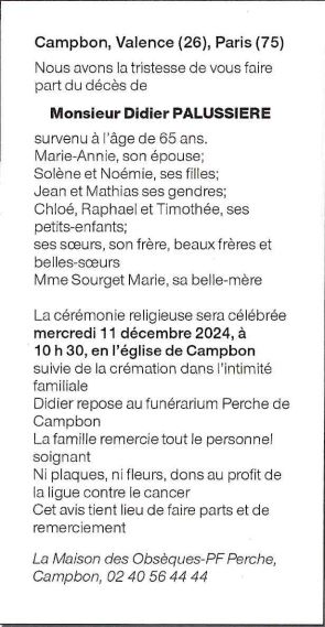 Cet espace « condoléances » est dédié à la mémoire de Monsieur Didier PALUSSIERE.