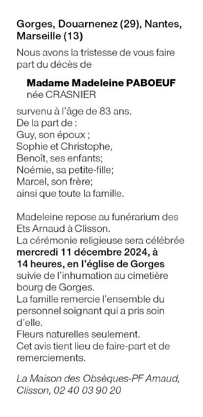Cet espace « condoléances » est dédié à la mémoire de Madame Madeleine PABOEUF née CRASNIER.