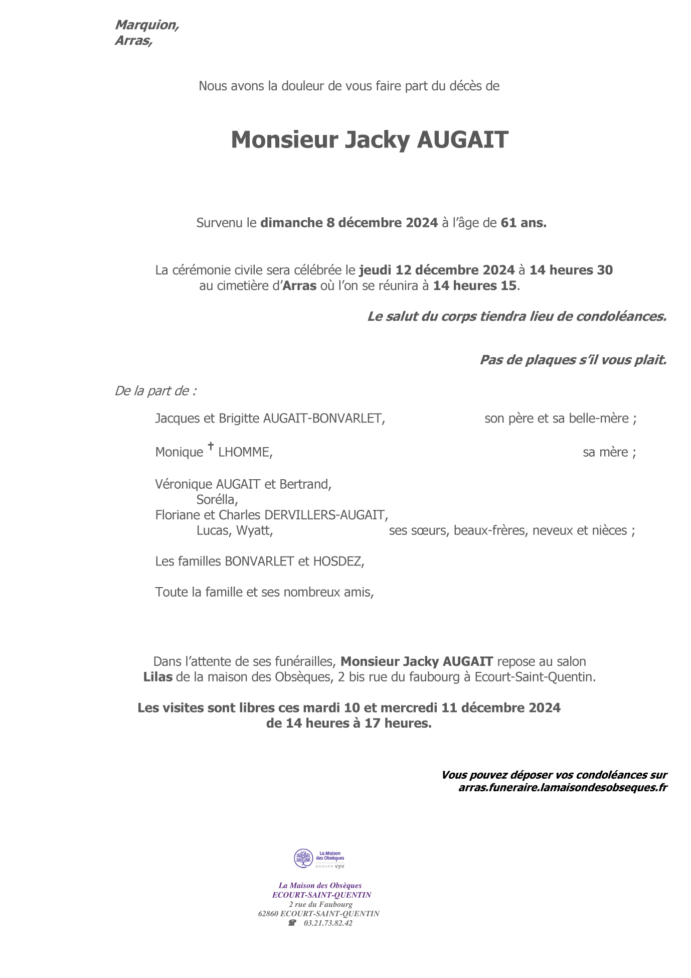 Cet espace « condoléances » est dédié à la mémoire de Monsieur Jacky AUGAIT.