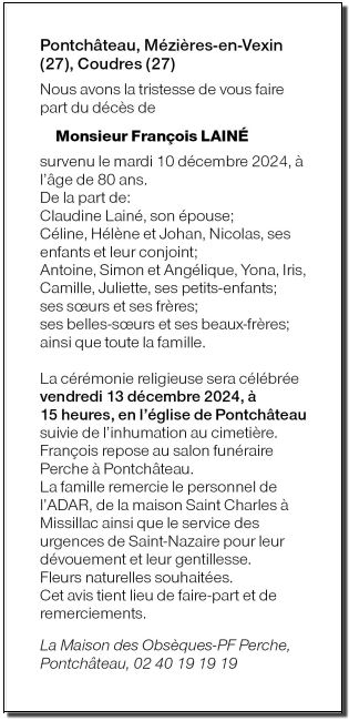 Cet espace « condoléances » est dédié à la mémoire de Monsieur FRANCOIS LAINE.