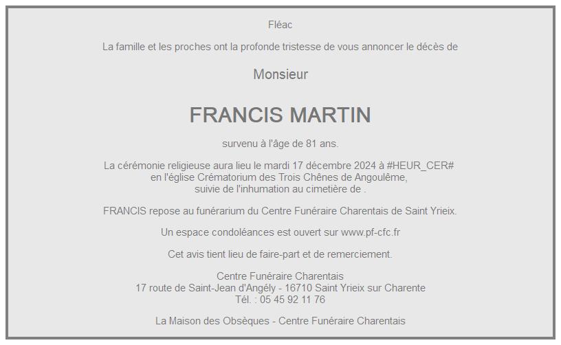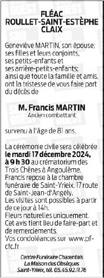 Cet espace « condoléances » est dédié à la mémoire de Monsieur FRANCIS MARTIN.