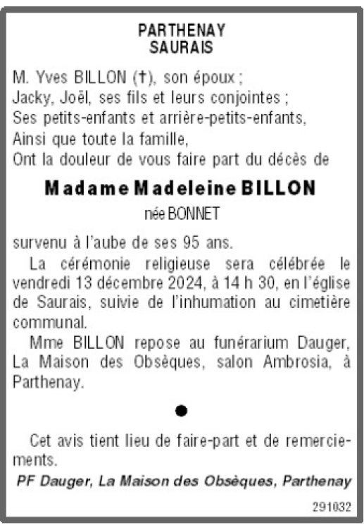 Cet espace « condoléances » est dédié à la mémoire de Madame Madeleine BILLON née BONNET.