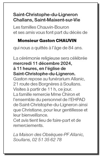 Décédé à Saint-Christophe-du-Ligneron (85670) le dimanche 8 décembre 2024