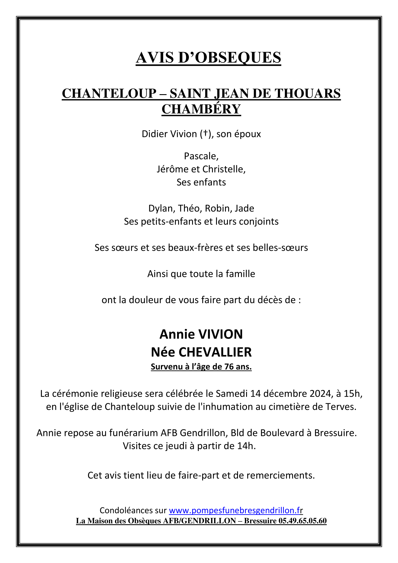 de Madame Annie VIVION née CHEVALLIER
