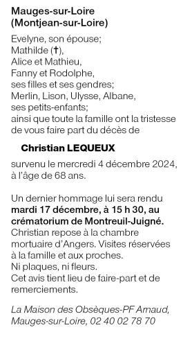 Cet espace « condoléances » est dédié à la mémoire de Monsieur Christian LEQUEUX.