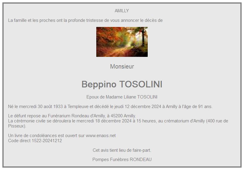 Cet espace « condoléances » est dédié à la mémoire de Monsieur Beppino TOSOLINI.