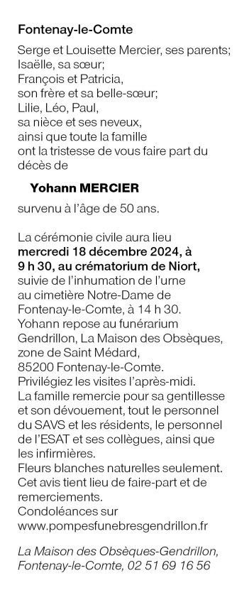 Cet espace « condoléances » est dédié à la mémoire de Monsieur Yohann MERCIER.