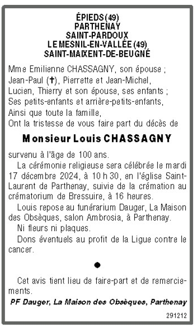 Cet espace « condoléances » est dédié à la mémoire de Monsieur Louis CHASSAGNY.
