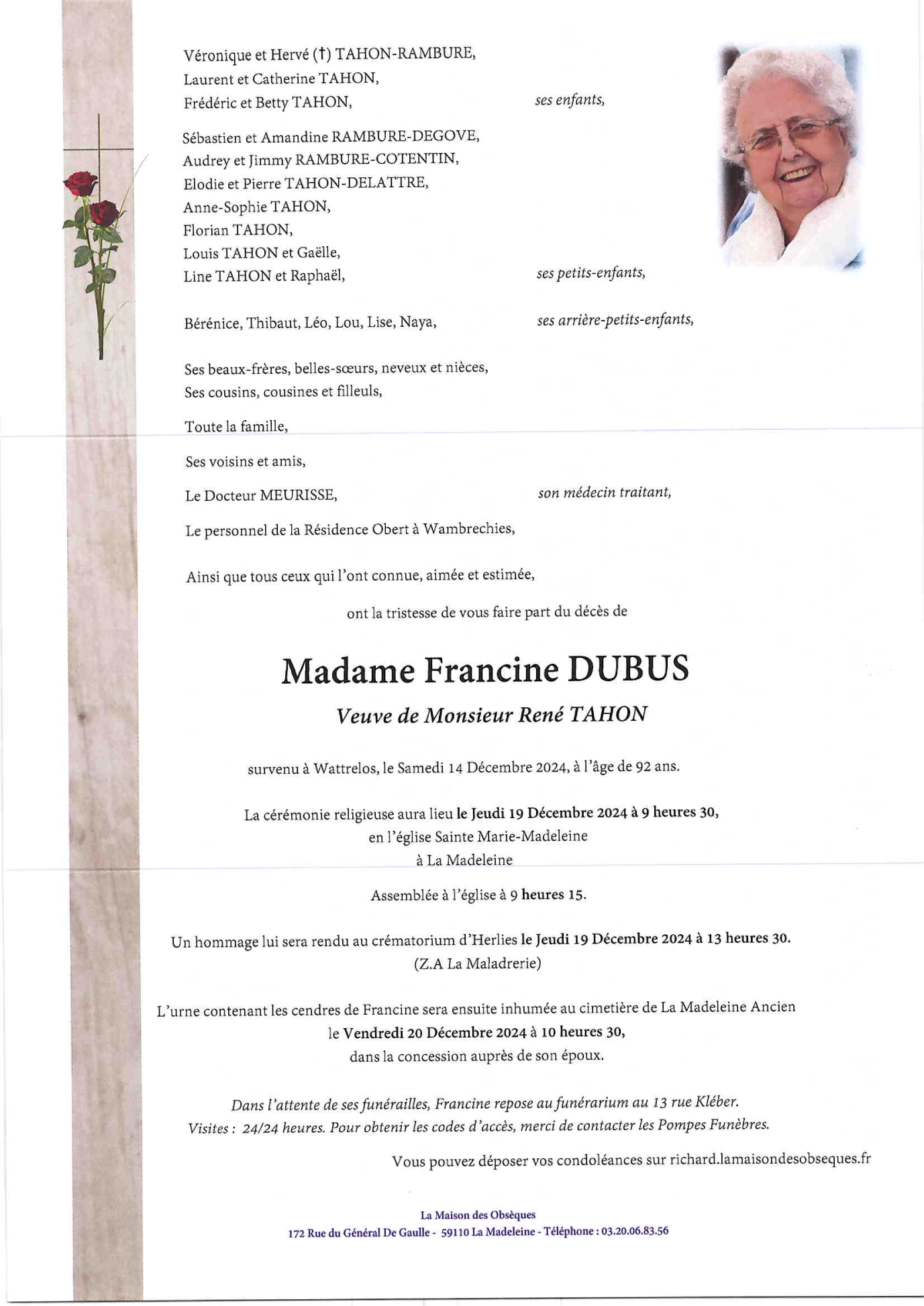 Cet espace « condoléances » est dédié à la mémoire de Madame Francine TAHON née DUBUS.
