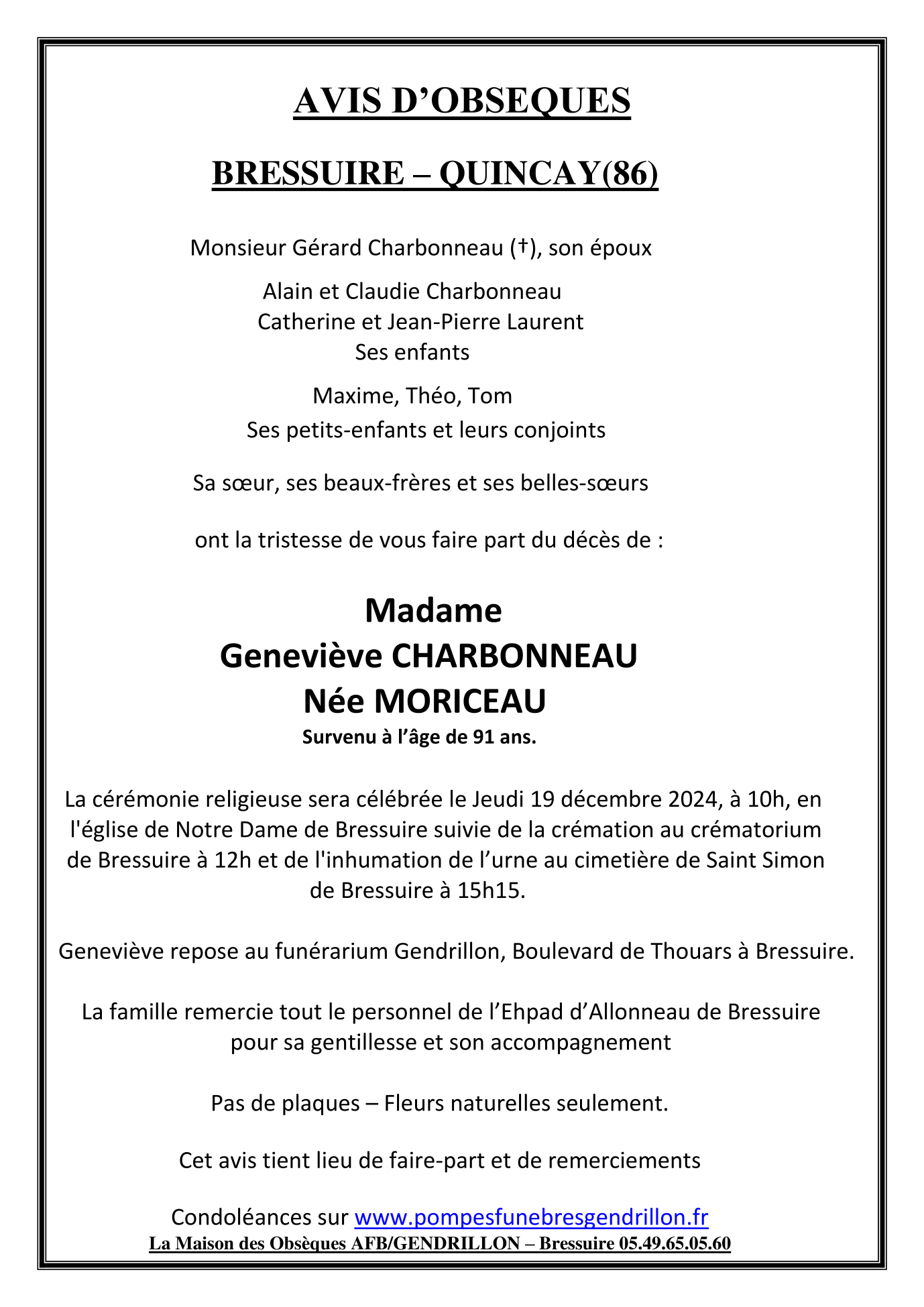de Madame Geneviève CHARBONNEAU née MORICEAU