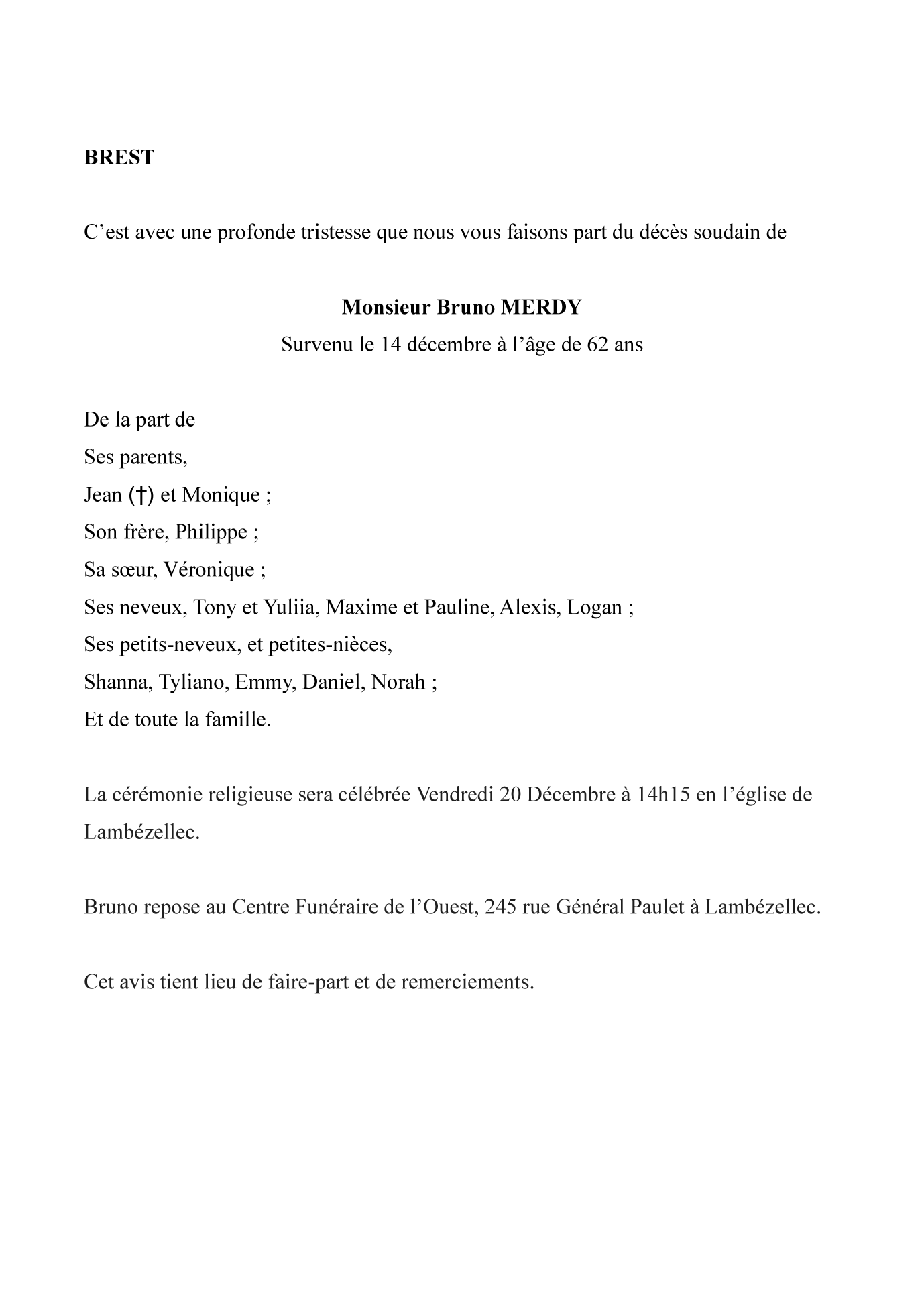 Cet espace « condoléances » est dédié à la mémoire de Monsieur Bruno MERDY.