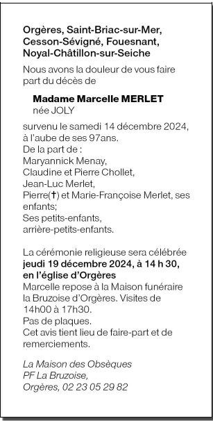 Cet espace « condoléances » est dédié à la mémoire de Madame Marcelle MERLET née JOLY.
